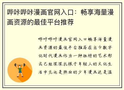 尾巴漫画网站免费:畅享海量漫画资源,轻松阅读无限乐趣 在数字化时代,漫画作为一种独特的艺术形式,受到了越来越多人的喜爱。无论是年轻人还是成年人,漫画都能带给他们无尽的乐趣和放松。而在众多漫画平台中,尾巴漫画网站以其丰富的资源和便捷的阅读体验,成为了众多漫画爱好者的首选。本文将深入探讨尾巴漫画网站...